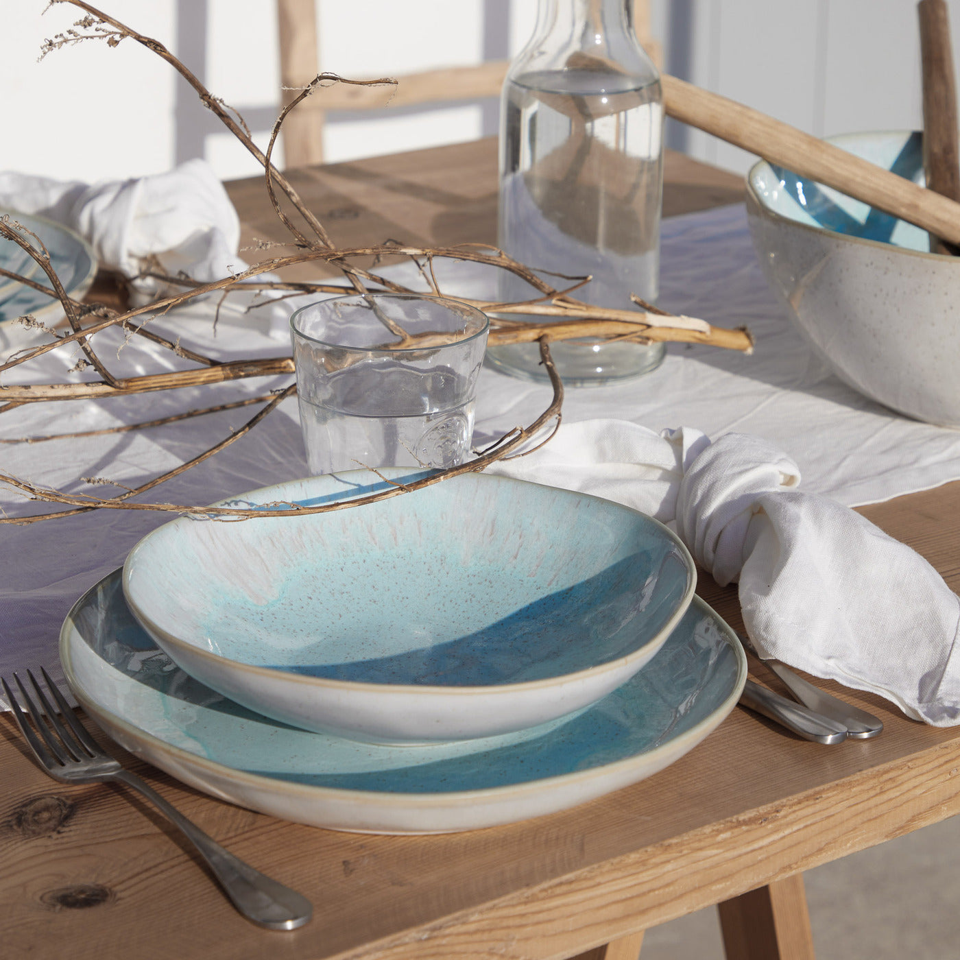 Discover Casafina's organic-shaped collection, Eivissa. The natural curves of the collection are enhanced by its artfully reactive glazes that create perfectly imperfect patterns of beige-sand and sea-blue on the interior. Eivissa showcases a striking interior finish, enhanced by a minimalistic white exterior. Organically-shaped and artfully glazed, no two pieces will ever look the same.
