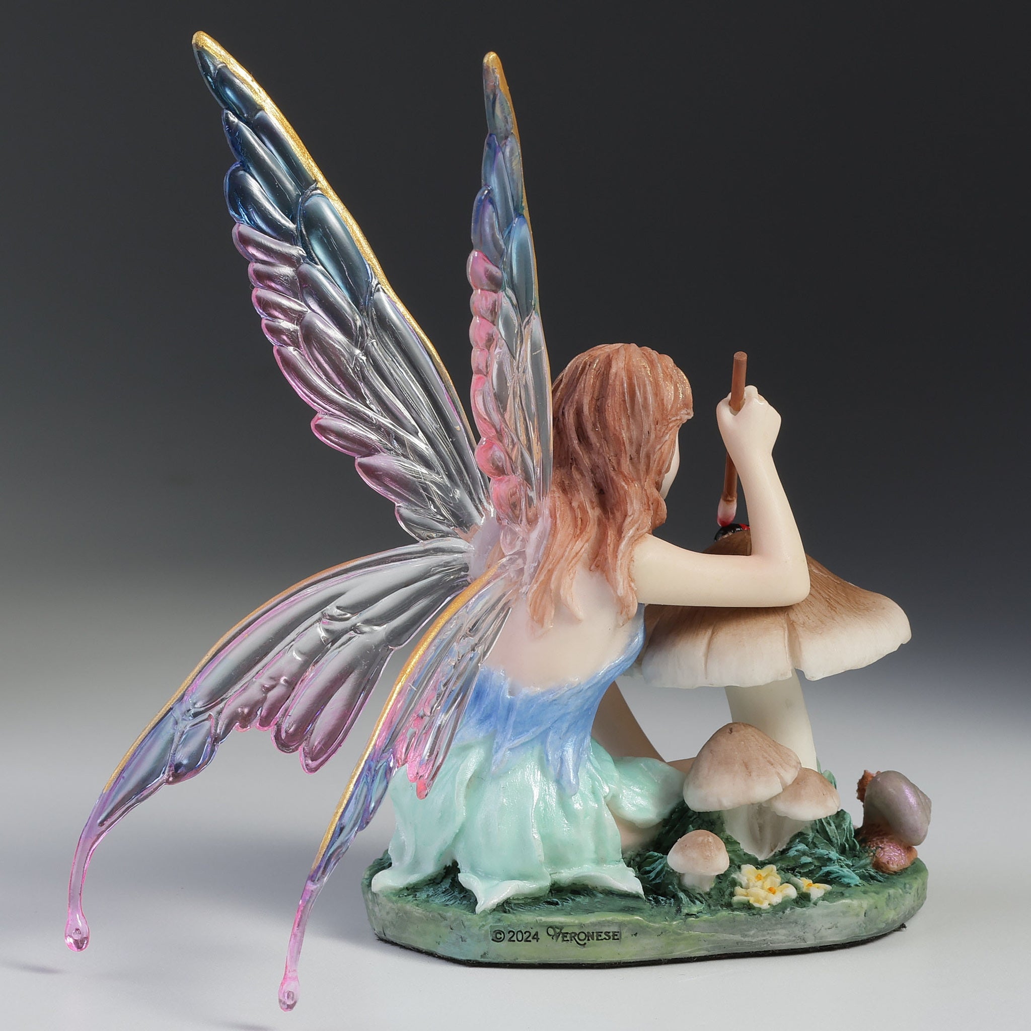 - Depicts a fairy with colorful wings painting a ladybug on a mushroom