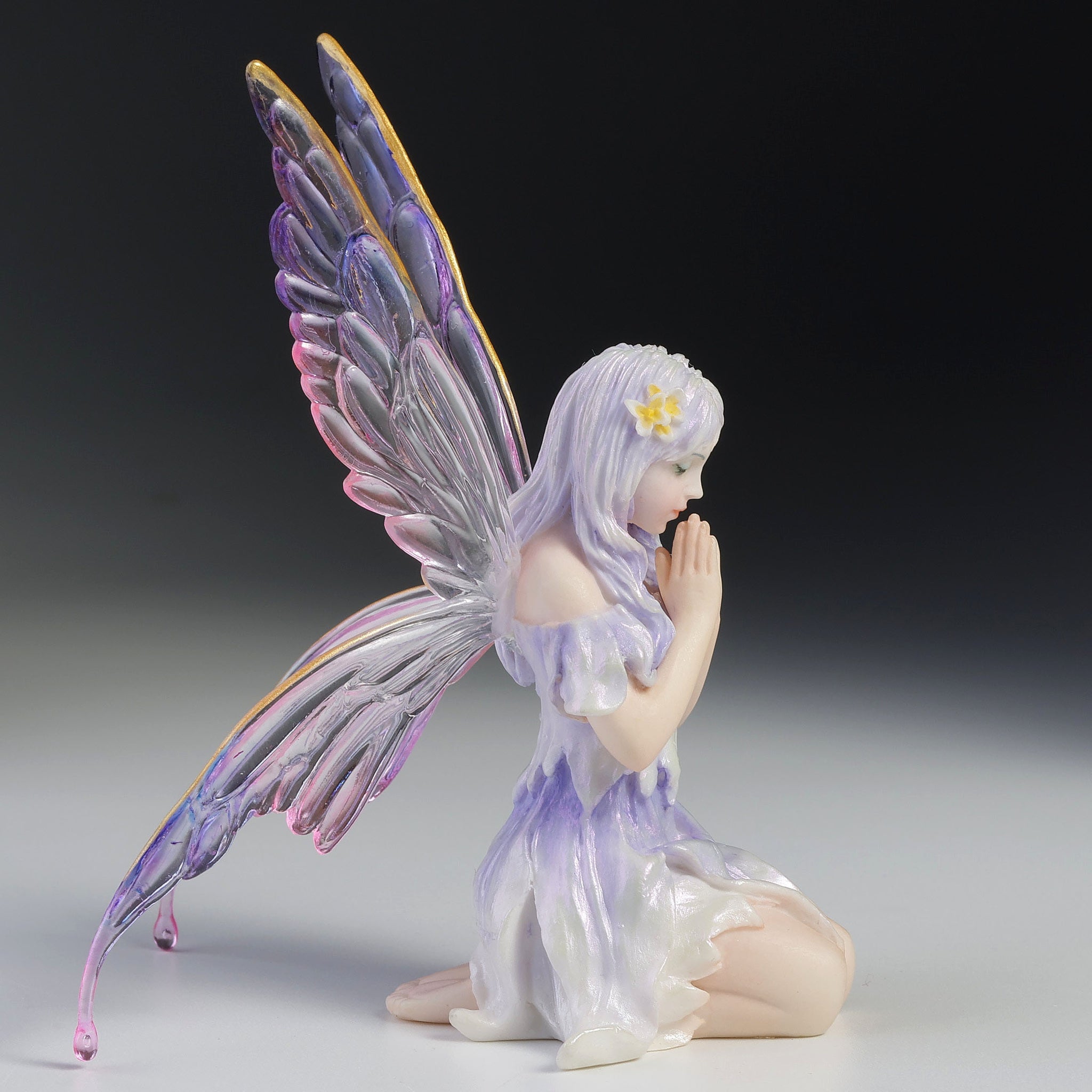 - Depicts a kneeling fairy in prayer with shimmering purple wings