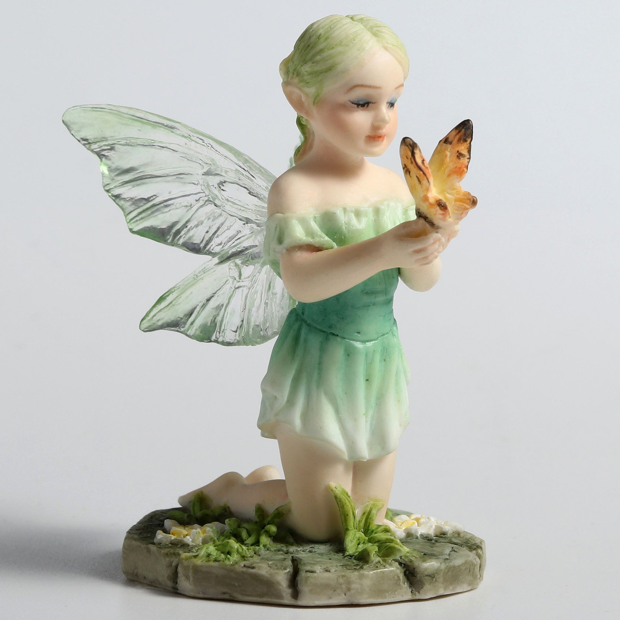 - Depicts a kneeling fairy gently holding a butterfly in her hands
