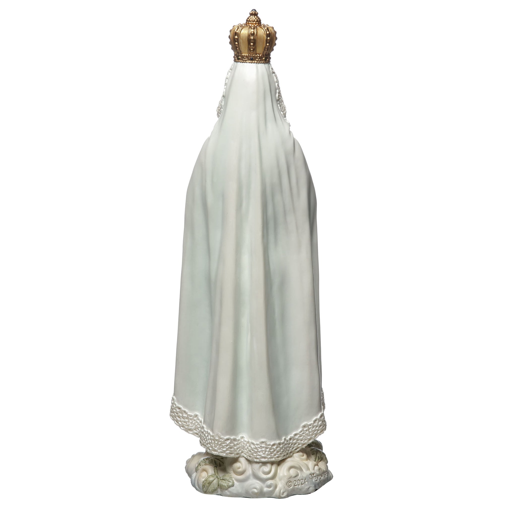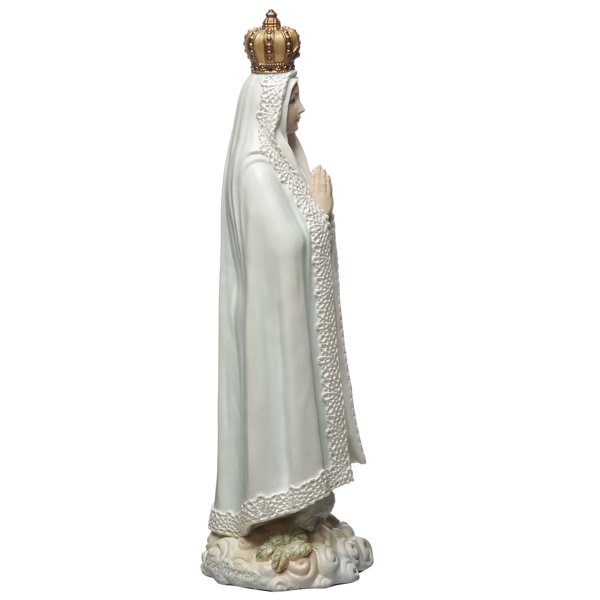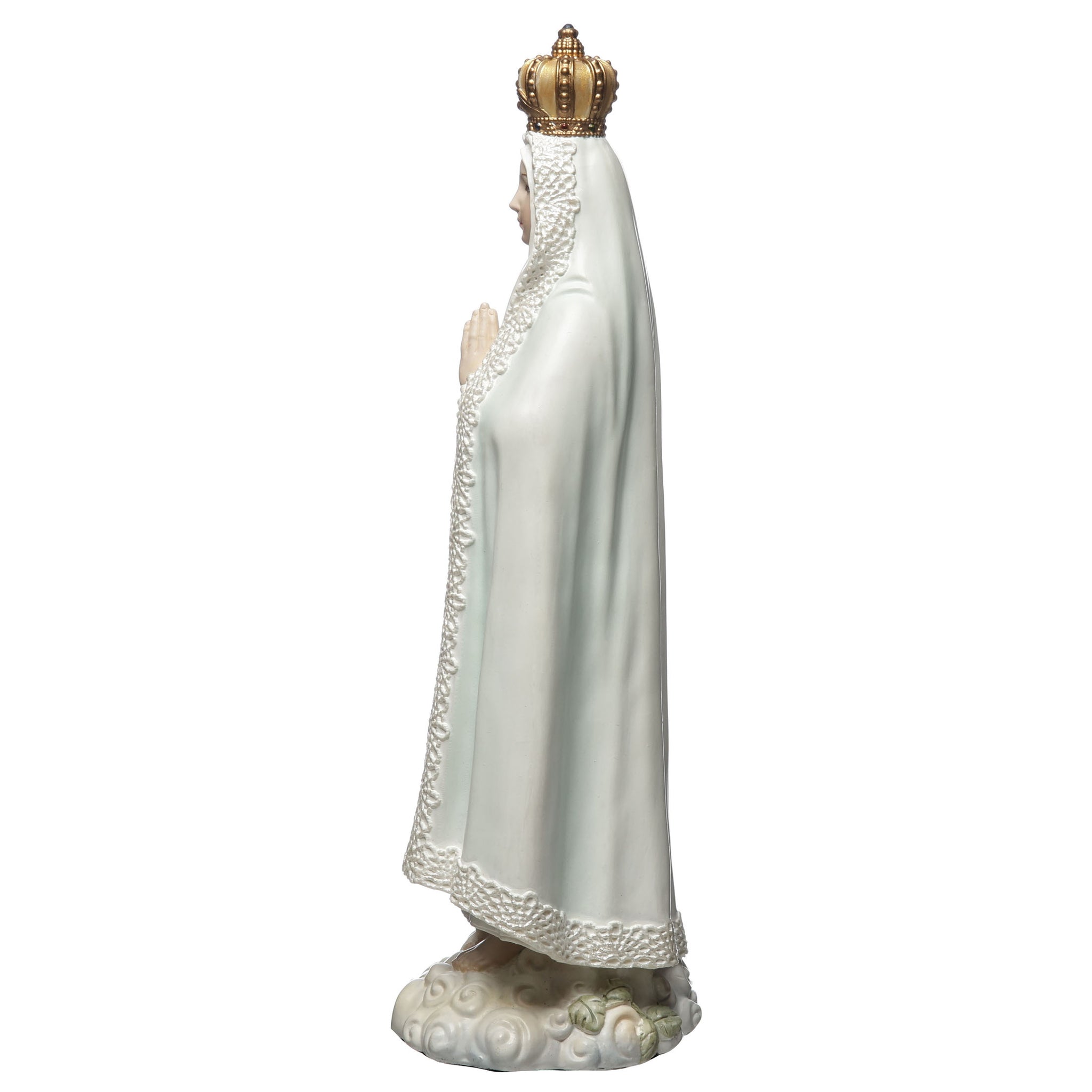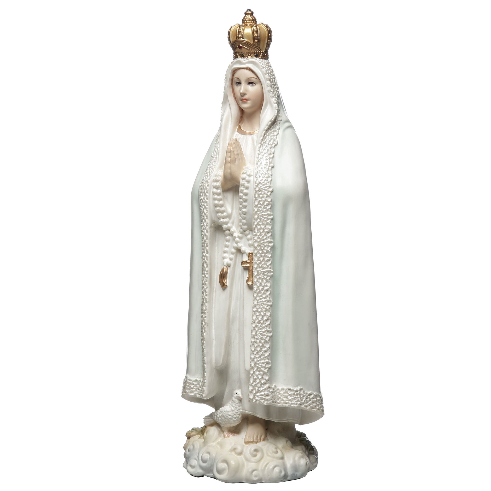 - Depicts Our Lady of Fatima with crown, rosary, and dove at her feet